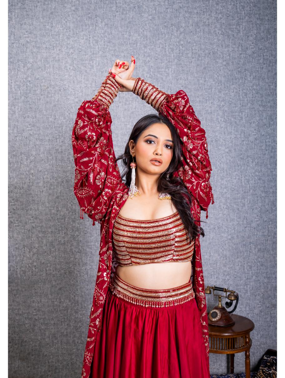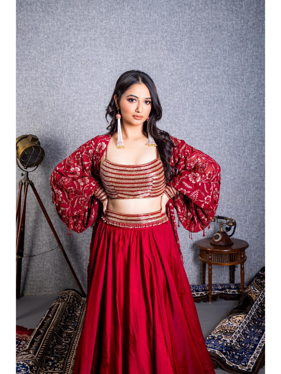 The outfit consists of a crop top, a jacket, and a skirt, all in a rich maroon color. The crop top is adorned with intricate sequence work, which adds a touch of sparkle and glamour. The sequence work is highlighted on the bodice and sleeves of the crop top, creating a beautiful focal point. The jacket is embroidered with maroon threadwork, creating an elegant and detailed design. The embroidery covers the entire jacket, and to enhance its beauty, self tassels are added all over the garment. These tassels add movement and texture to the jacket, making it a statement piece. The skirt is plain maroon and complements the embellished top and jacket. It has a belt that is also highlighted with sequence work and tassels. The belt adds definition to the waistline while maintaining the overall elegance of the outfit.