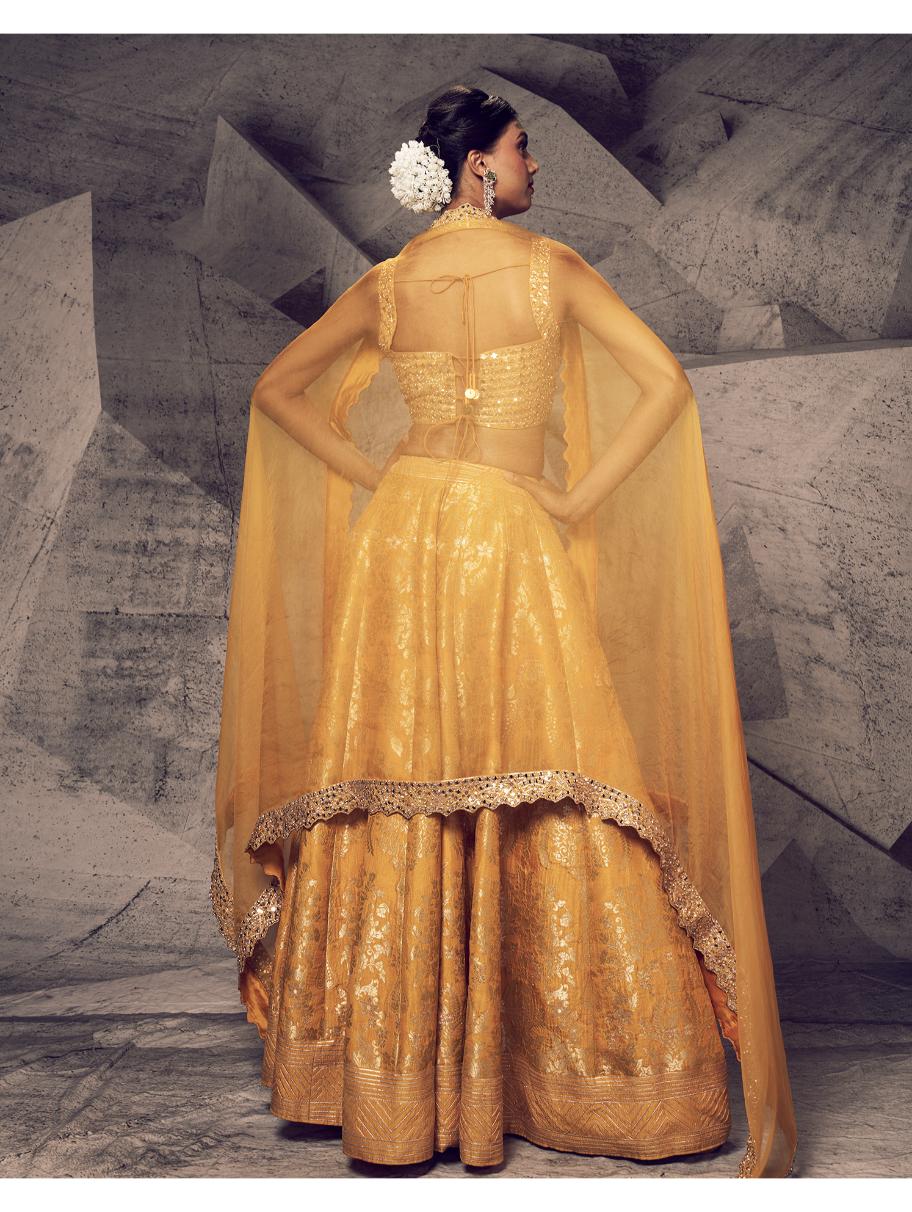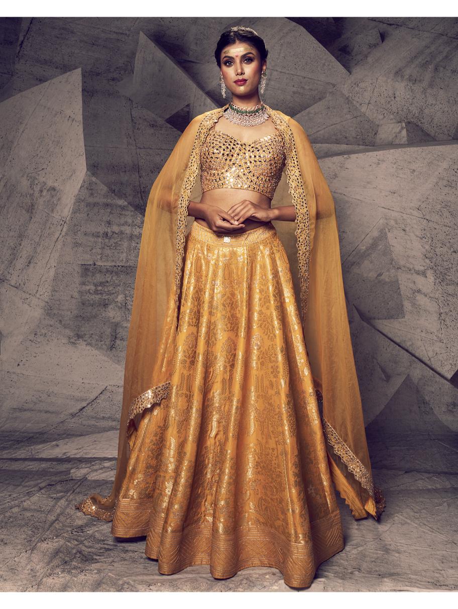 Enveloped between the festive hues of marigold and glimmering brocade woven embroidery work lies this beautiful lehenga...