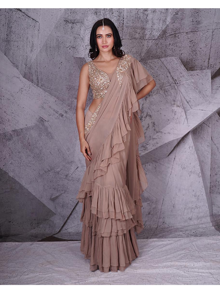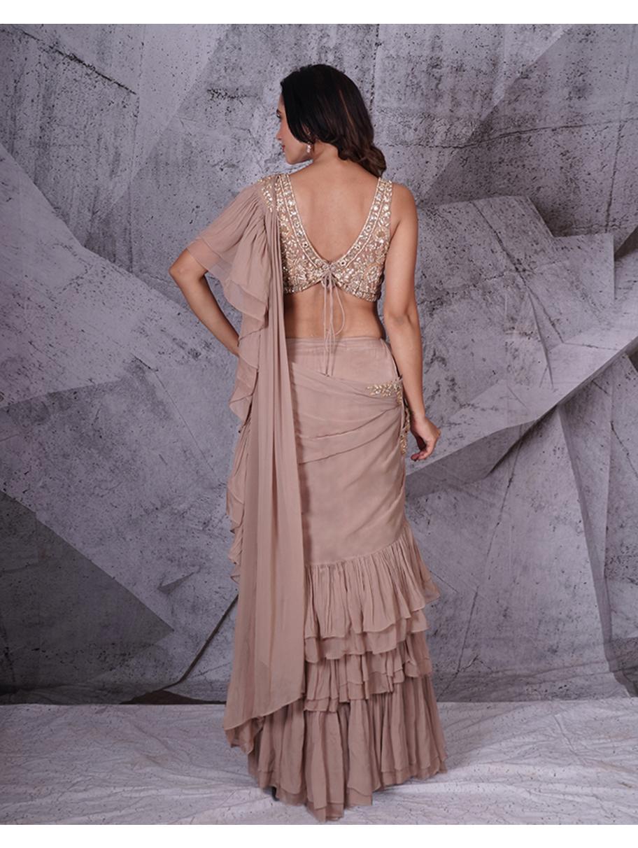 Enveloped between the earth hues of beige and shimmering floral gold embroidery work lies this beautiful sari....