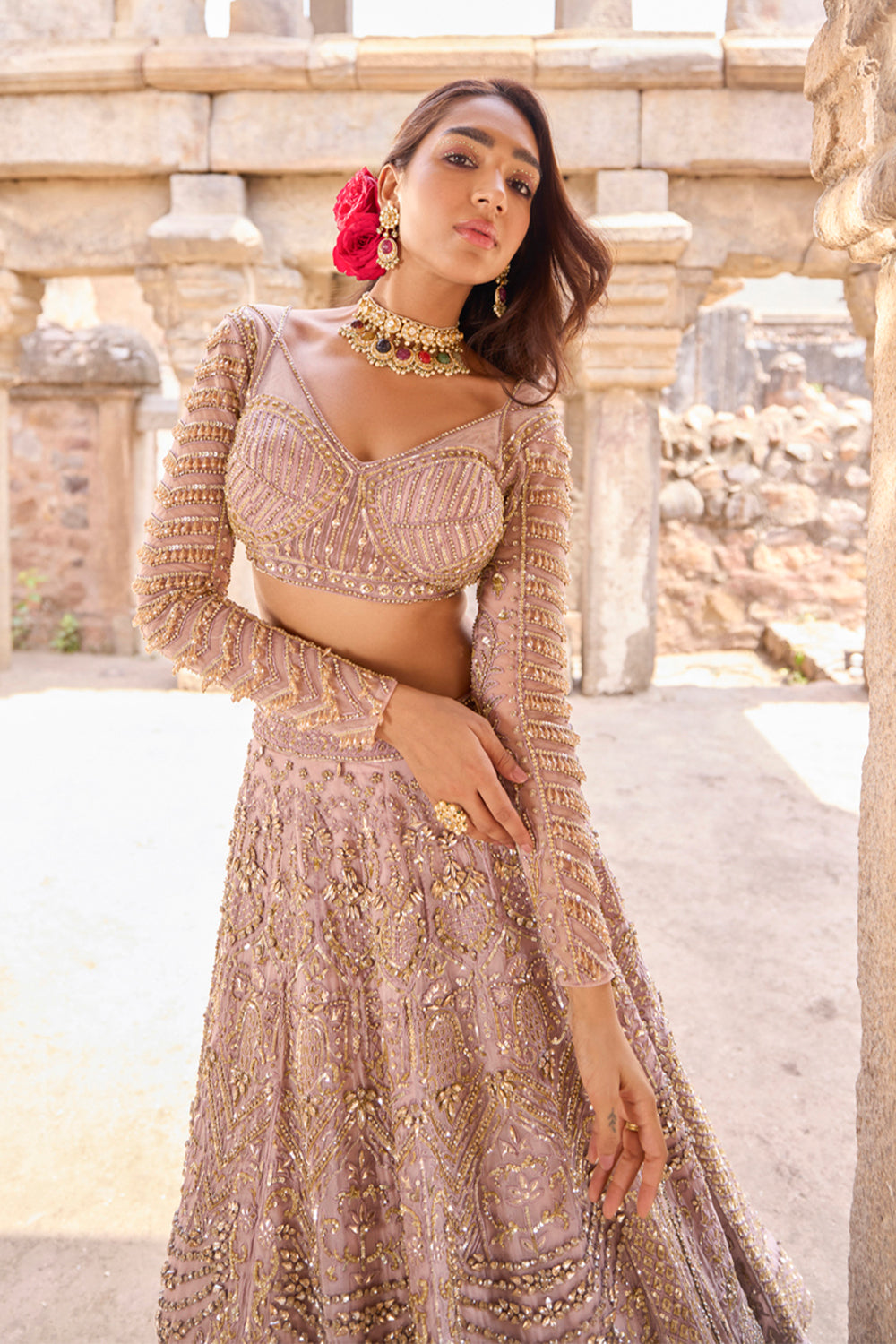 Haydee represents sequin, glass beads swaroski crystal embroidery on organza base. it has floral and geometric design and is pared with full sleeve blouse with tassels detailing on sleeves. it comes with a matching heavy embroidered tulle dupatta.