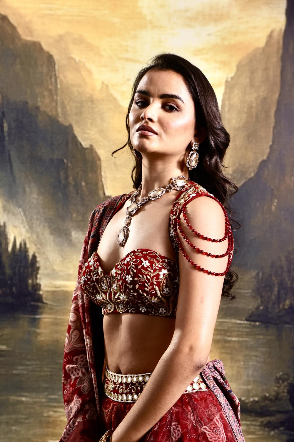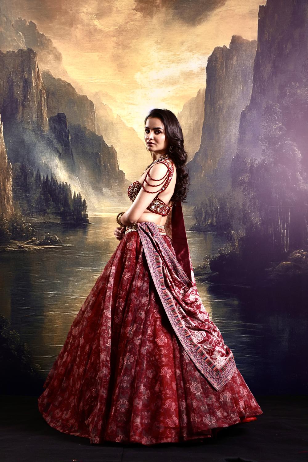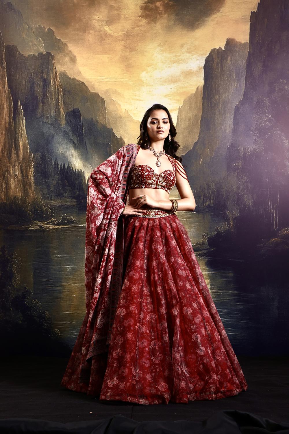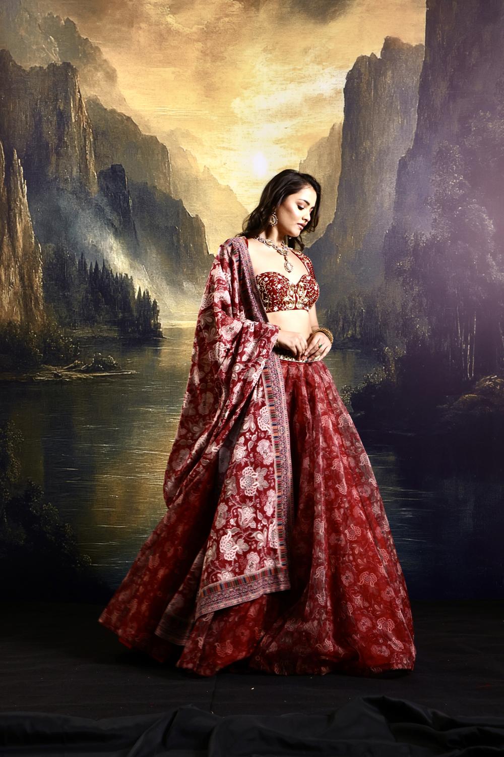 Floral printed organza lehenga with hand embroidered blouse with tassel detail and printed georgette dupatta