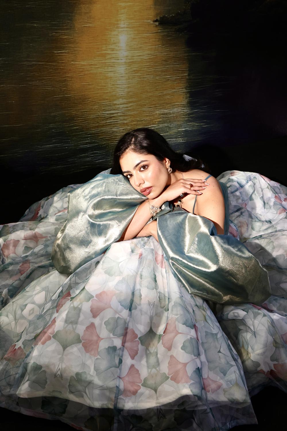 Printed organza lehenga with our signiture pleated tissue blouse. paired with our statement tissue cuff dupatta with net
