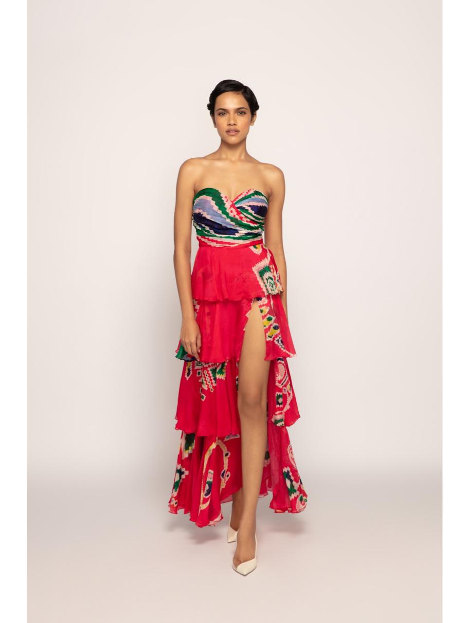 PASILEY PRINT, 8 TIER STRAPLESS DRESS WITH CUSTOMISABLE SIDE SLIT AND CROSS OVER BUSTIER DETAILING Composition: CHIFFON...