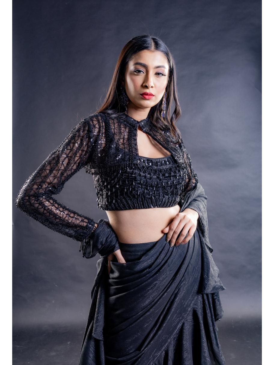 Indulge in sophistication with this exquisite black blouse, featuring mesmerizing geometric designs embellished with self pearls, sequins, and cutdana embroidery. Adding an extra touch of elegance, a beautiful short jacket complements the blouse perfectly. Paired with a black shimmer layered saree, this ensemble is ideal for any classic function, exuding timeless charm and grace. With its understated yet captivating allure, this ensemble is guaranteed to turn heads wherever you go, making you the center of attention with every step you take.