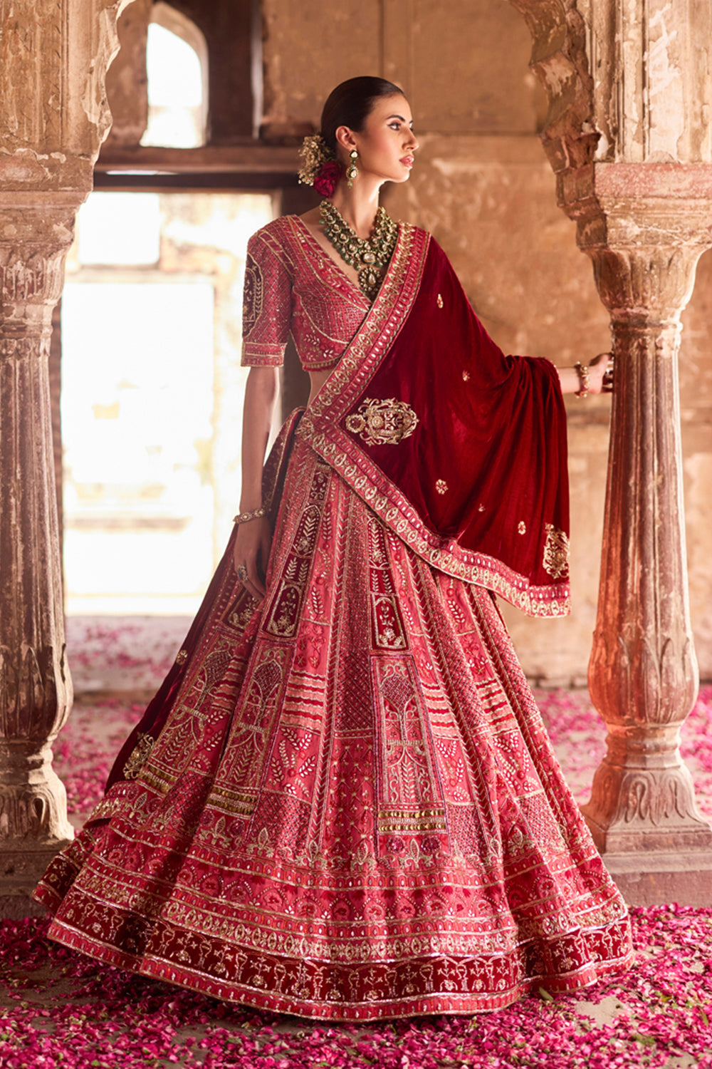 This ensemble is a made for a bride who is a diva with her feet rooted in traditions. embroideries inspired by the charms of rajasthan using nakshi, gota, dabka & zardosi crafts combined together on velvet applique in shades of maroon and red to give a mystic and regal look. the intricate 3 dimensional embroidery and rich textures bring out the authenticity and beauty of the meticulous craftsmanship. ‘ariana’ features a culmination of all intricate and varied techniques that exist to form a magnificent bridal lehenga to celebrate the most important occasion of your life. the choli is hand embroidered with a stunning plunging neckline and is paired with velvet dushala to complete the royal look.
