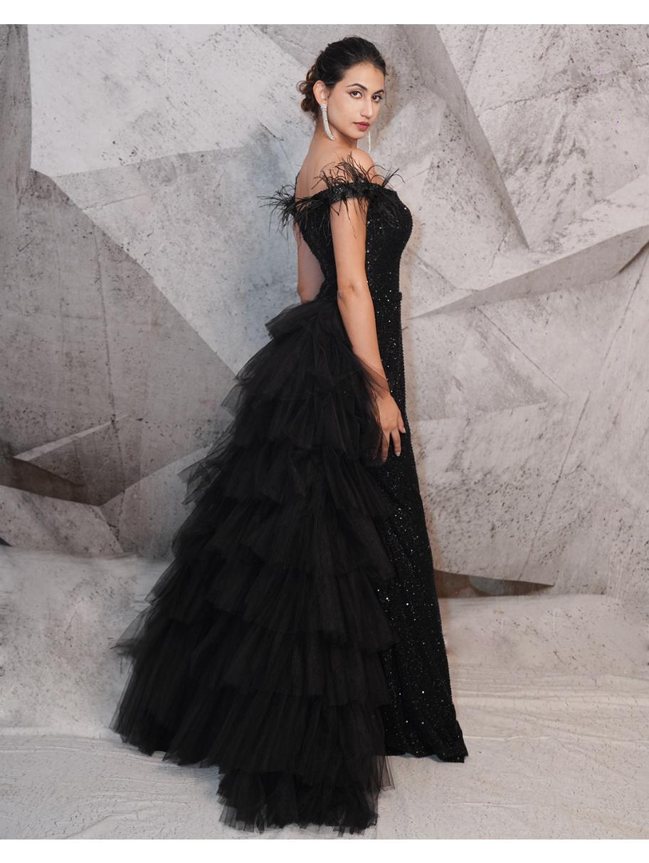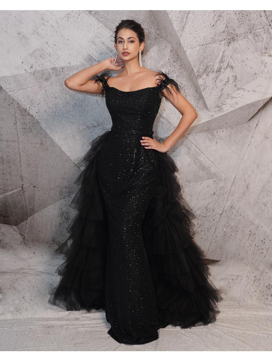 Enveloped between the bold hues of black and glittering beaded hand work lies this gown. The gown...