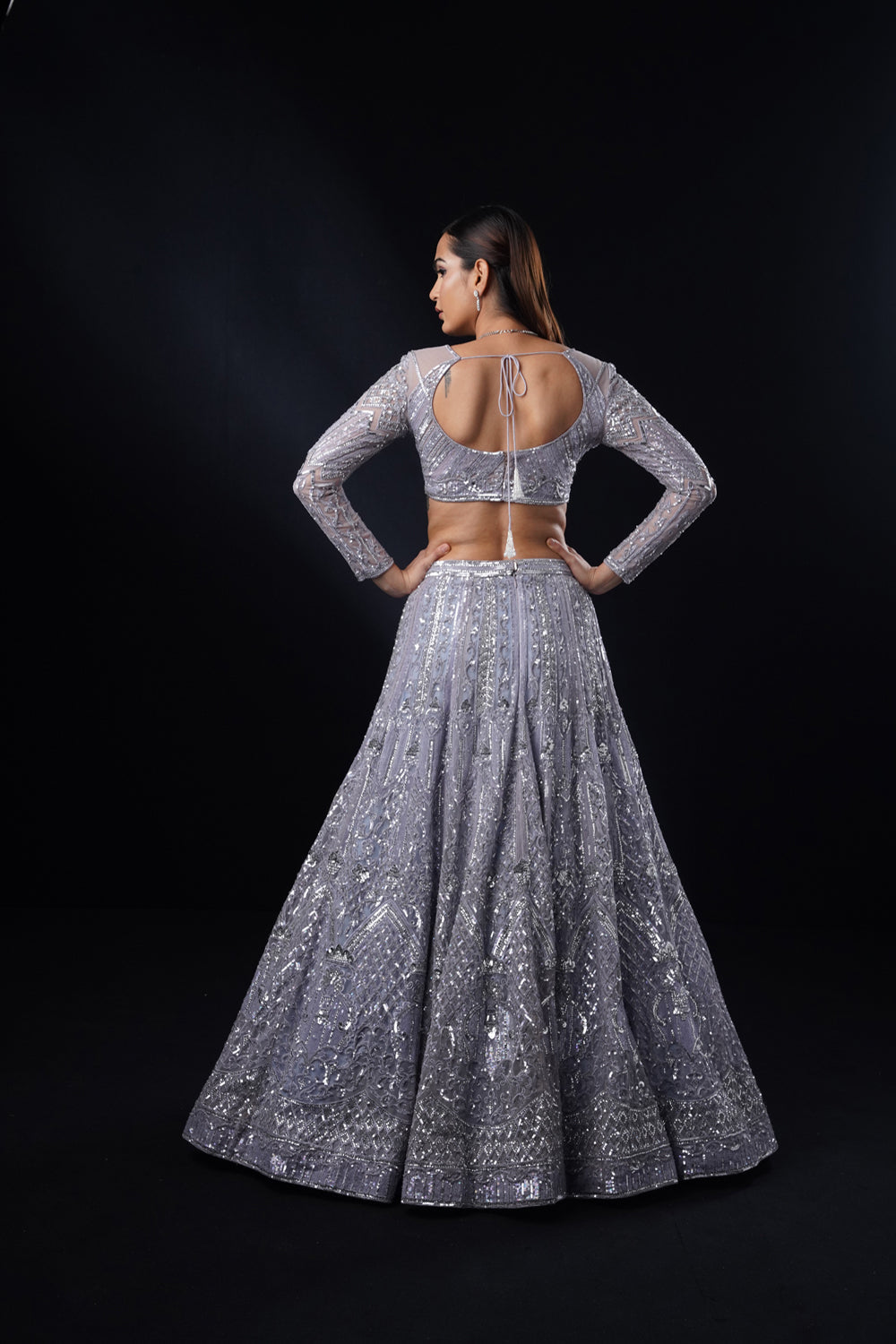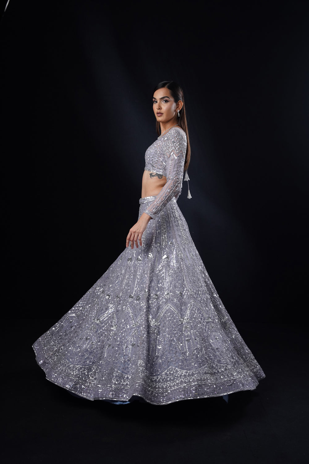 Featuring an sapphire colour lehenga in geometric artwork adorned with glass beads, sequins and crystals on tulle base. it is paired with a v neckline full sleeves blouse and styled with an embroidered matching dupatta.