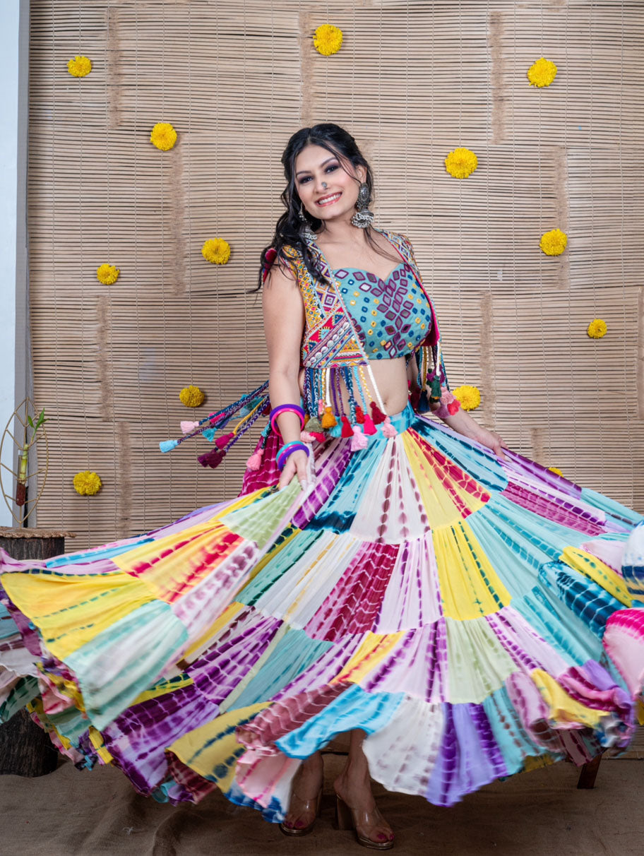 Description: Blouse and layered Shibori lehenga with embroidered jacket. Composition: Cotton and organza Instruction: Dry clean Delivery:...