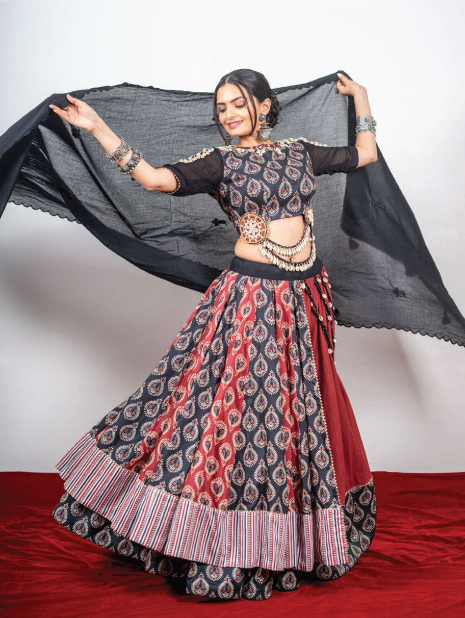 Description: A mal cotton black lehenga with print and details on the blouse. Composition: Cotton Dupatta -...