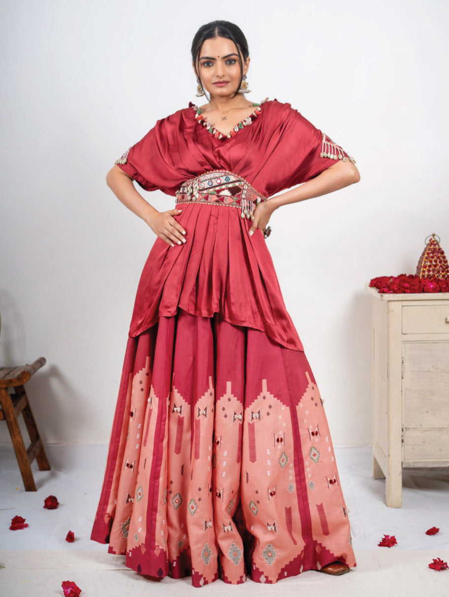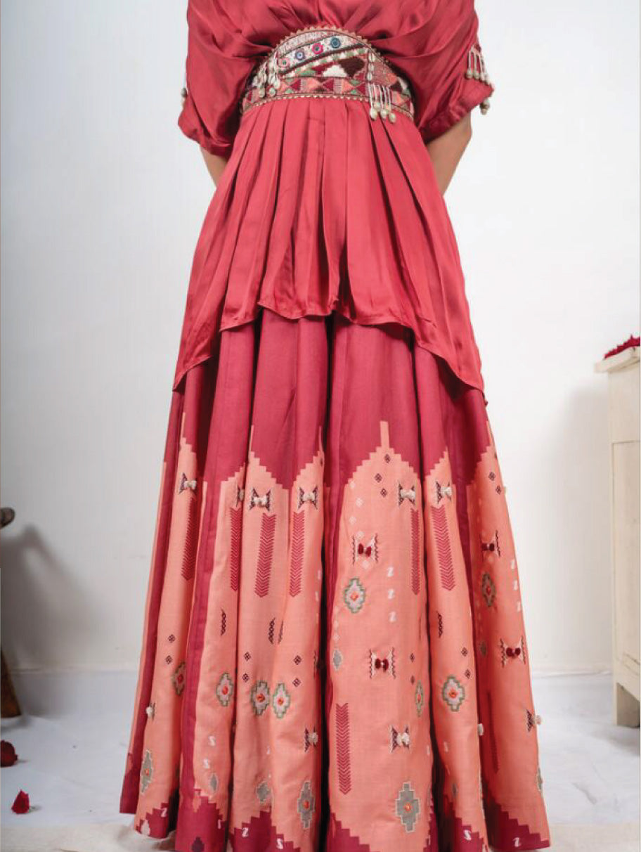 Description: A contemporary gown in the tone of pink and red with embroidery details on the neckline,...