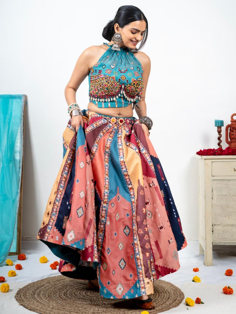 Description: A blue colour lehenga with print and embroidery on the blouse and attached dupatta with koi...