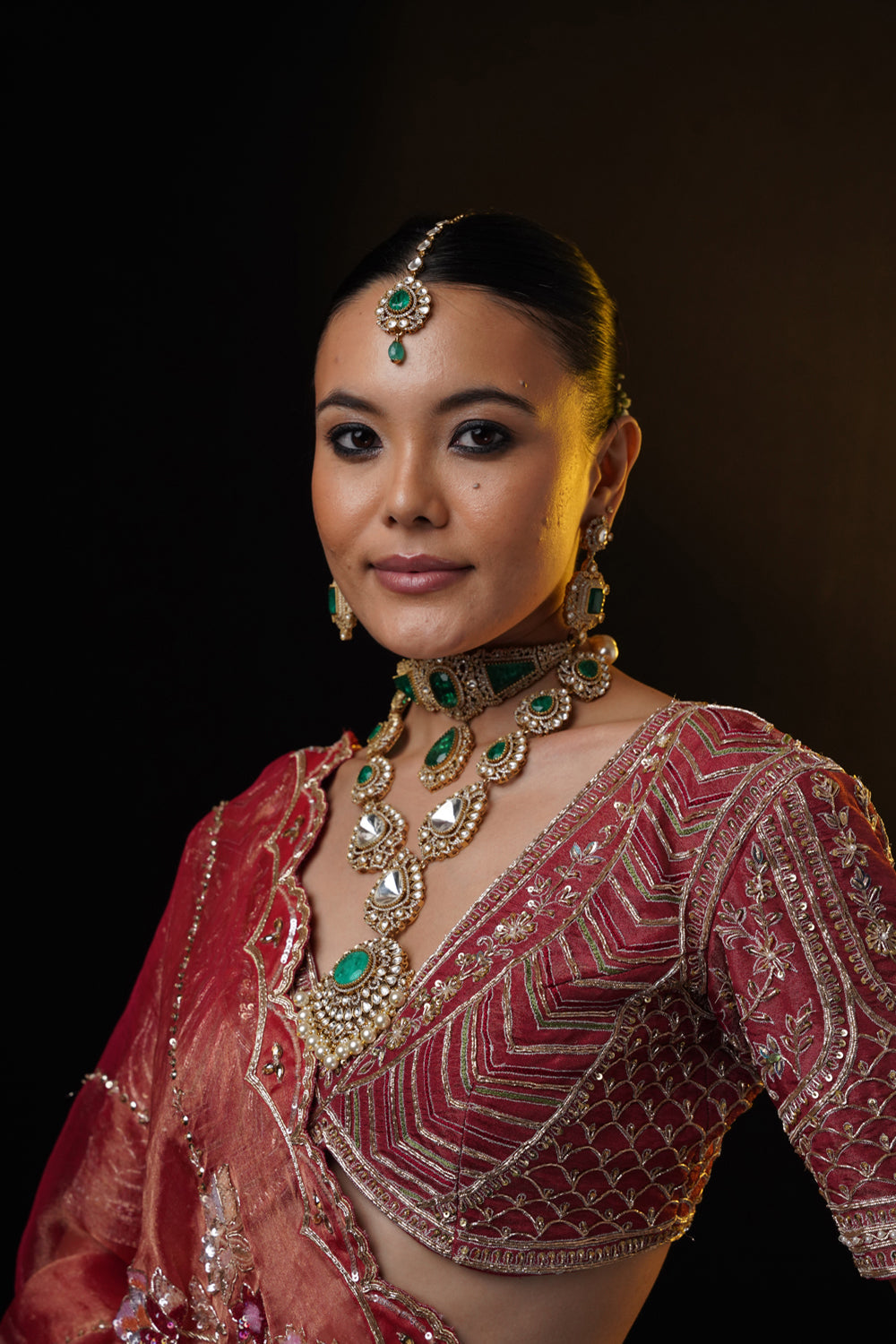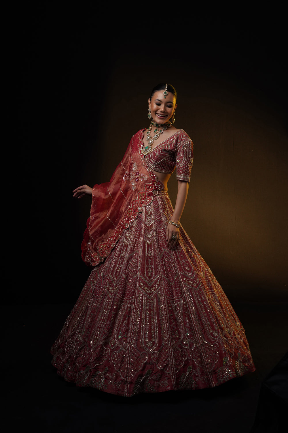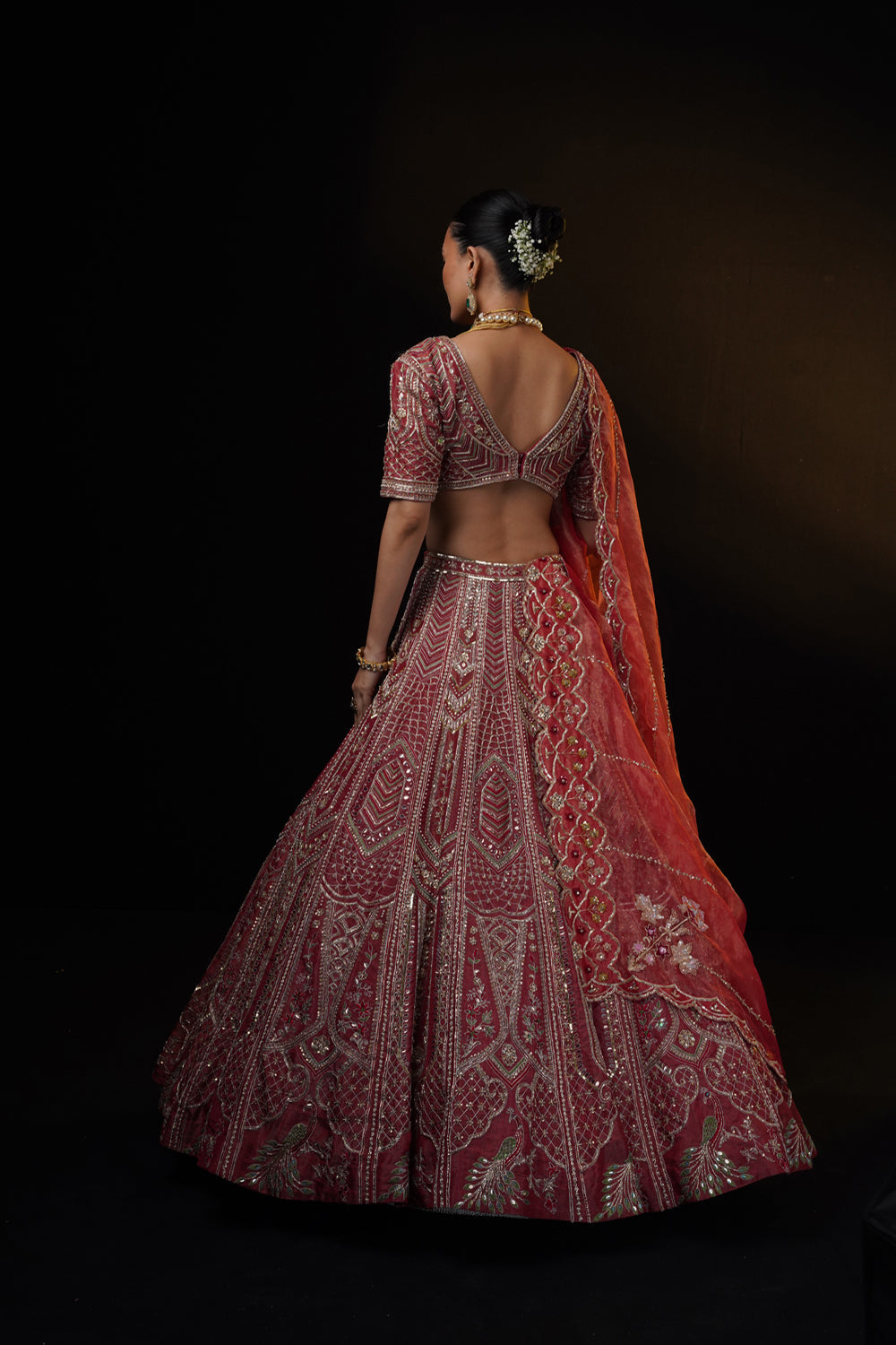 Red bridal lehenga with architectural, flora and fauna motifs on tissue base. it is adorned with heavy zardosi, resham and sequins. the lehenga is styled with a v neckline blouse and tissue embroidered dupatta in front and tulle embroidered dupatta on head.