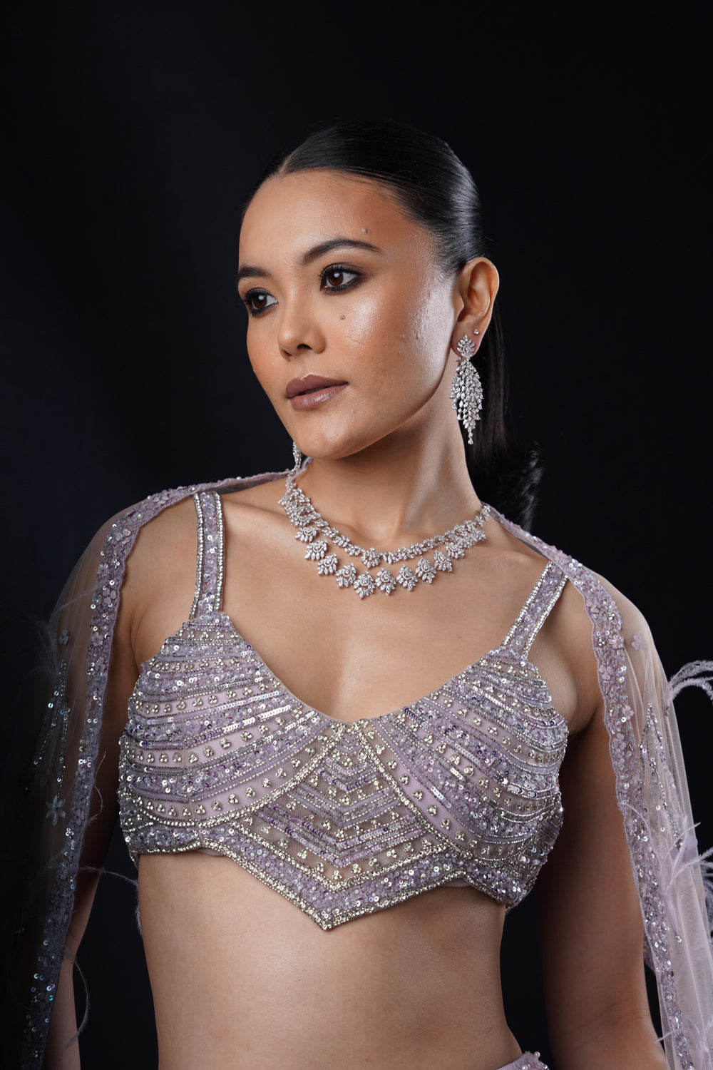 Lilac fishcut lehenga set adorned with glass beads, sequins and 3d tassels on tulle base. it is paired with a sleeveless blouse and heavy embroidered cape with feathers.