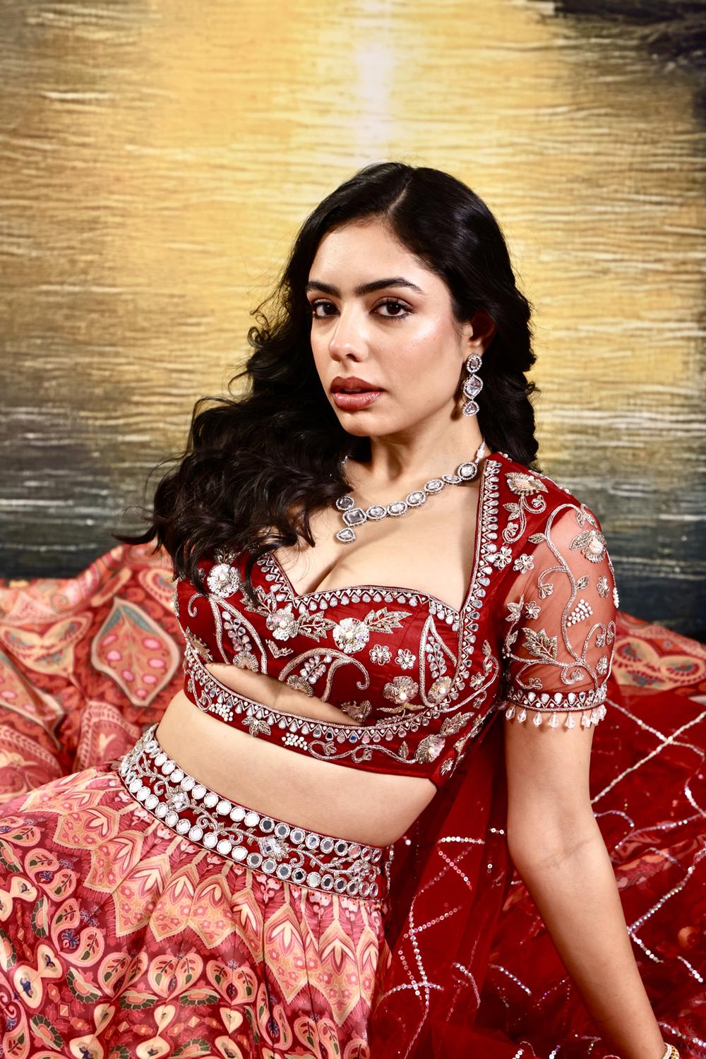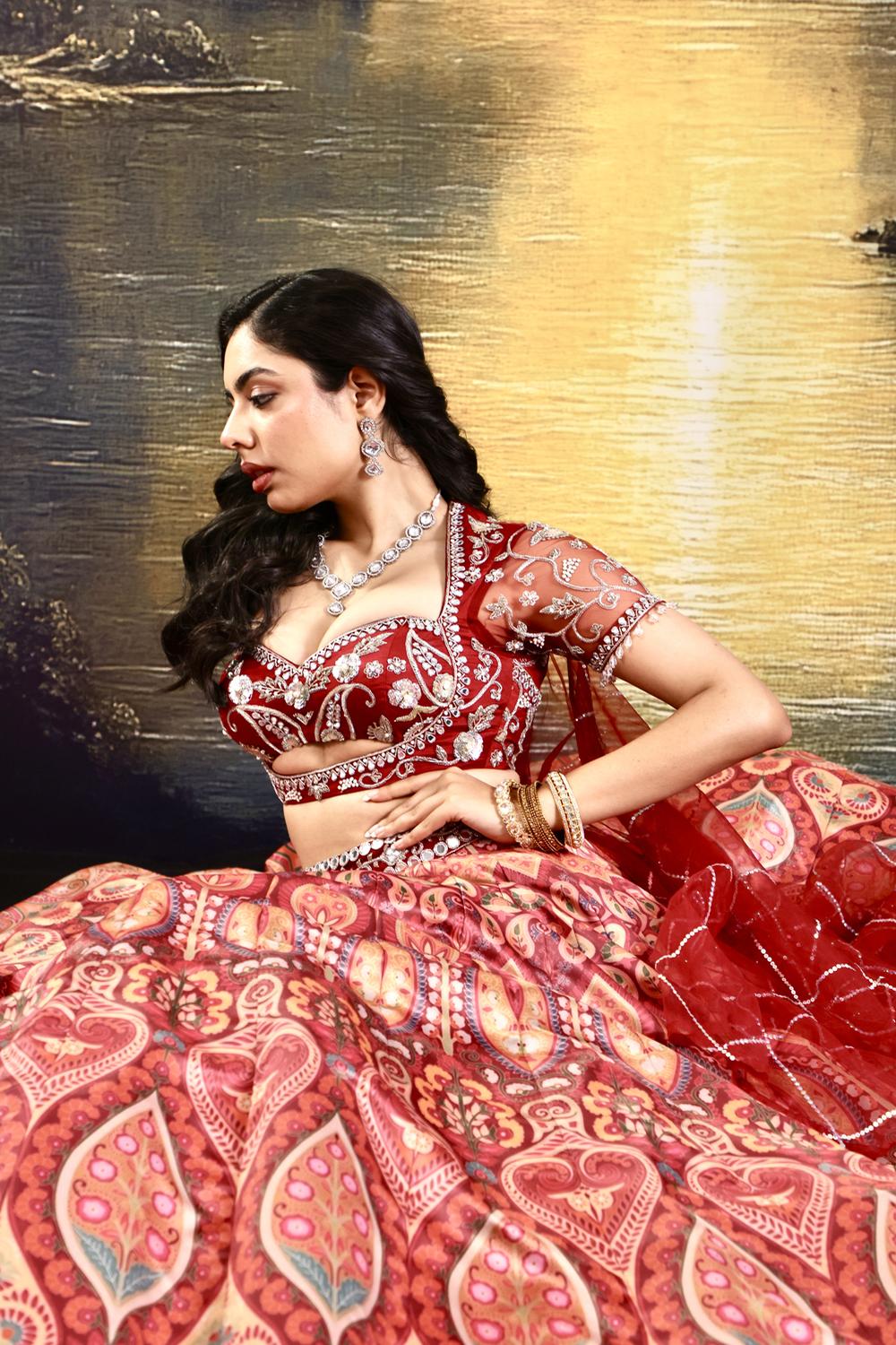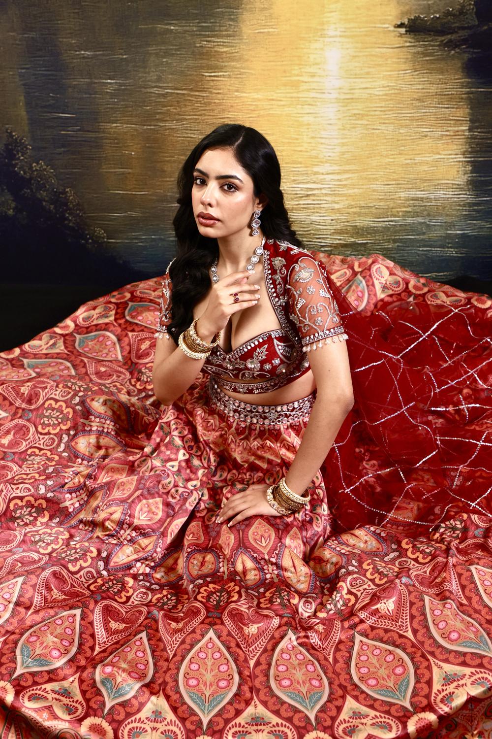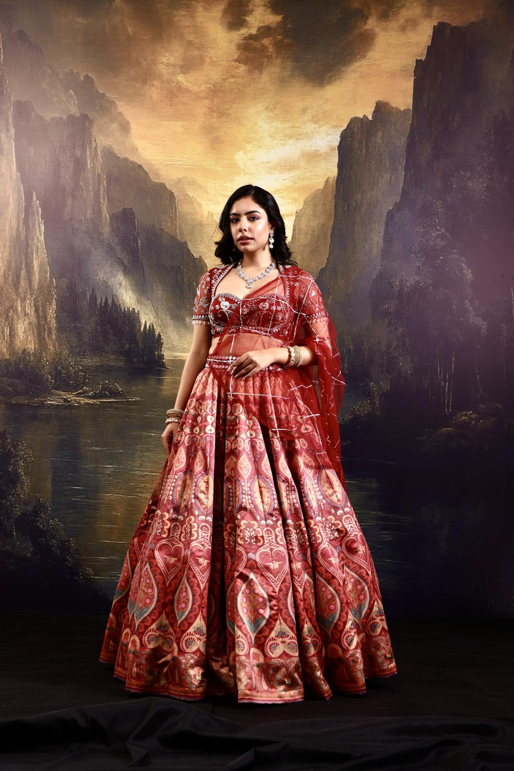 Floral printed satin lehenga paired with hand embroidered net cut out blouse with tassel details. paired with net embroidered dupatta