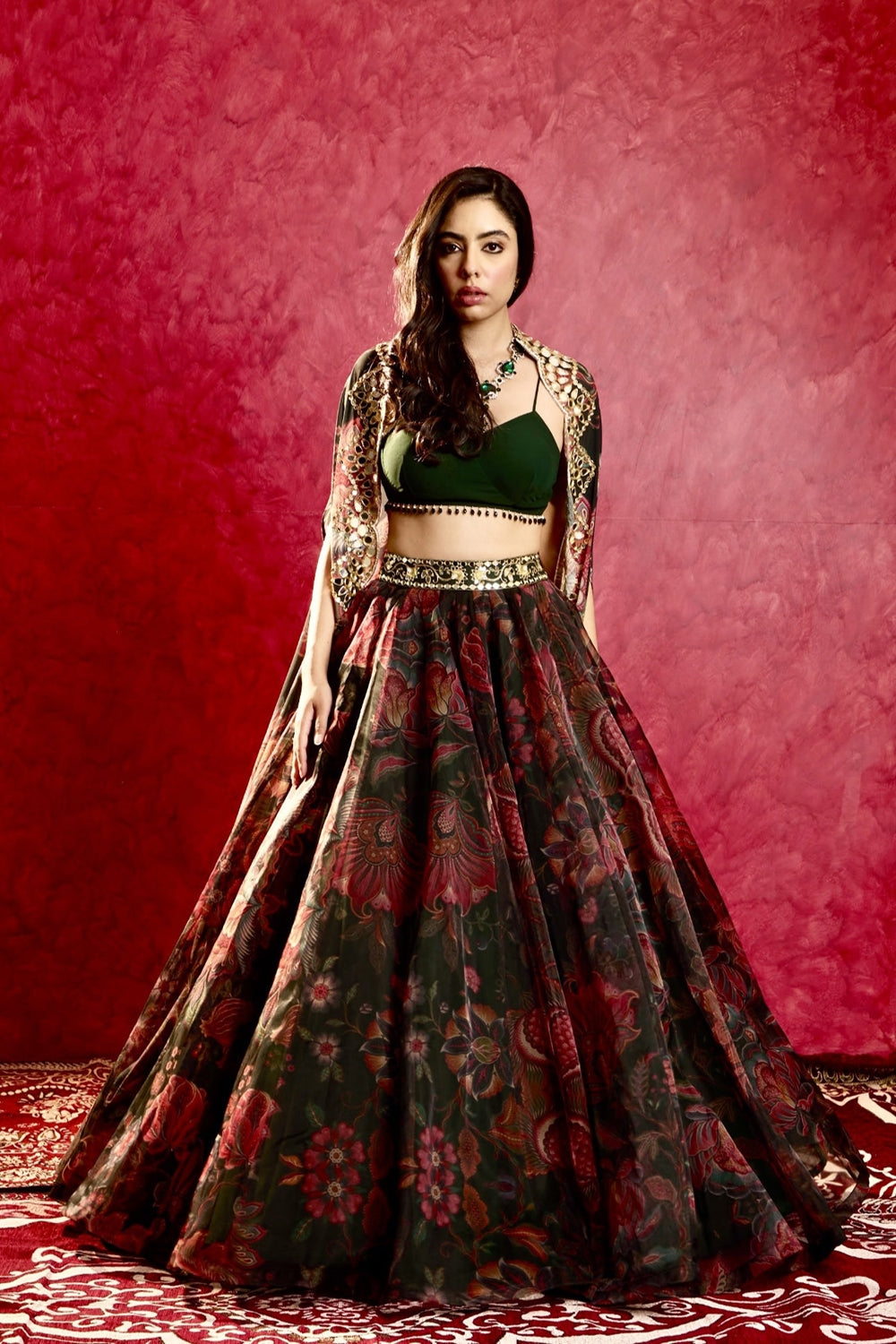 Floral printed green organza lehenga paired with georgette tasseled bustier and hand embroidered georgette cape